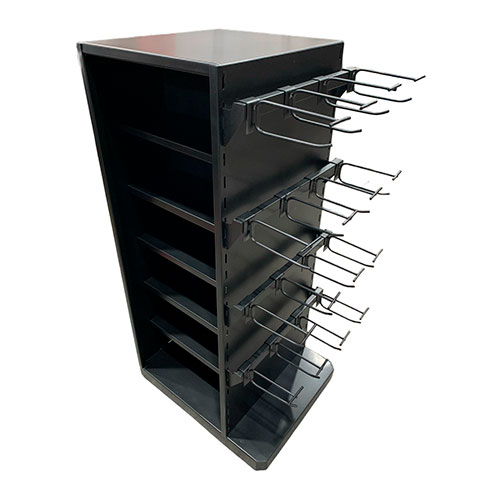 Checkstand com prateleiras e ganchos para exposição.